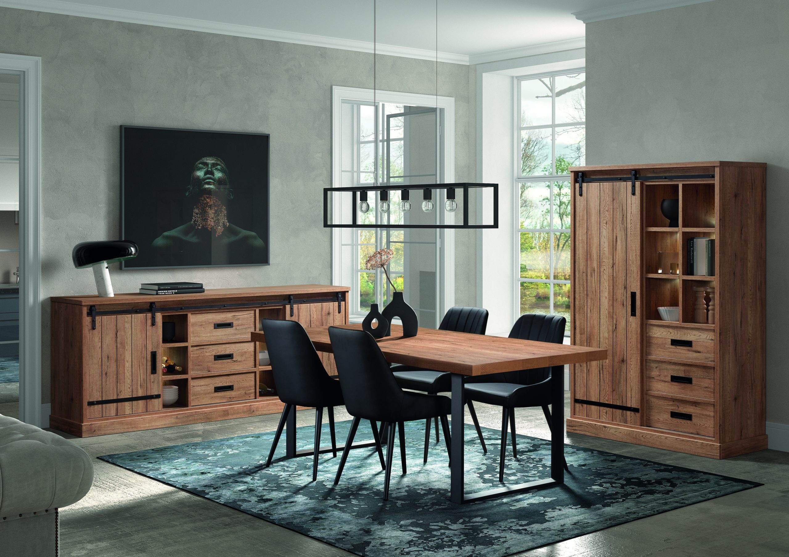 Salles à mangerSalle à manger de style cottage en teinte Nox-noir, différents meubles et dimensions de tables. -