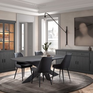 Salles à mangerSalle à manger de style cottage en teinte Nox-noir, différents meubles et dimensions de tables. -